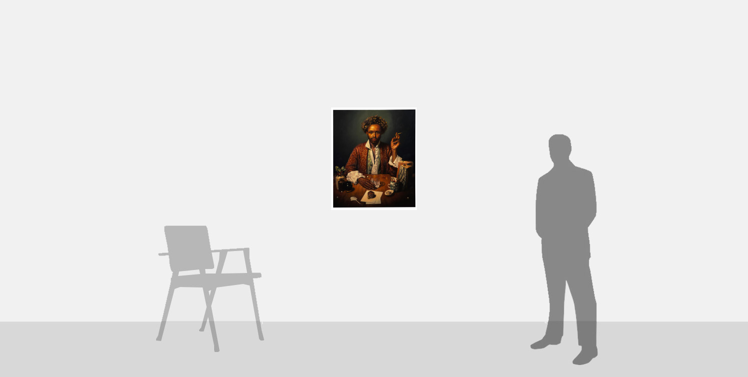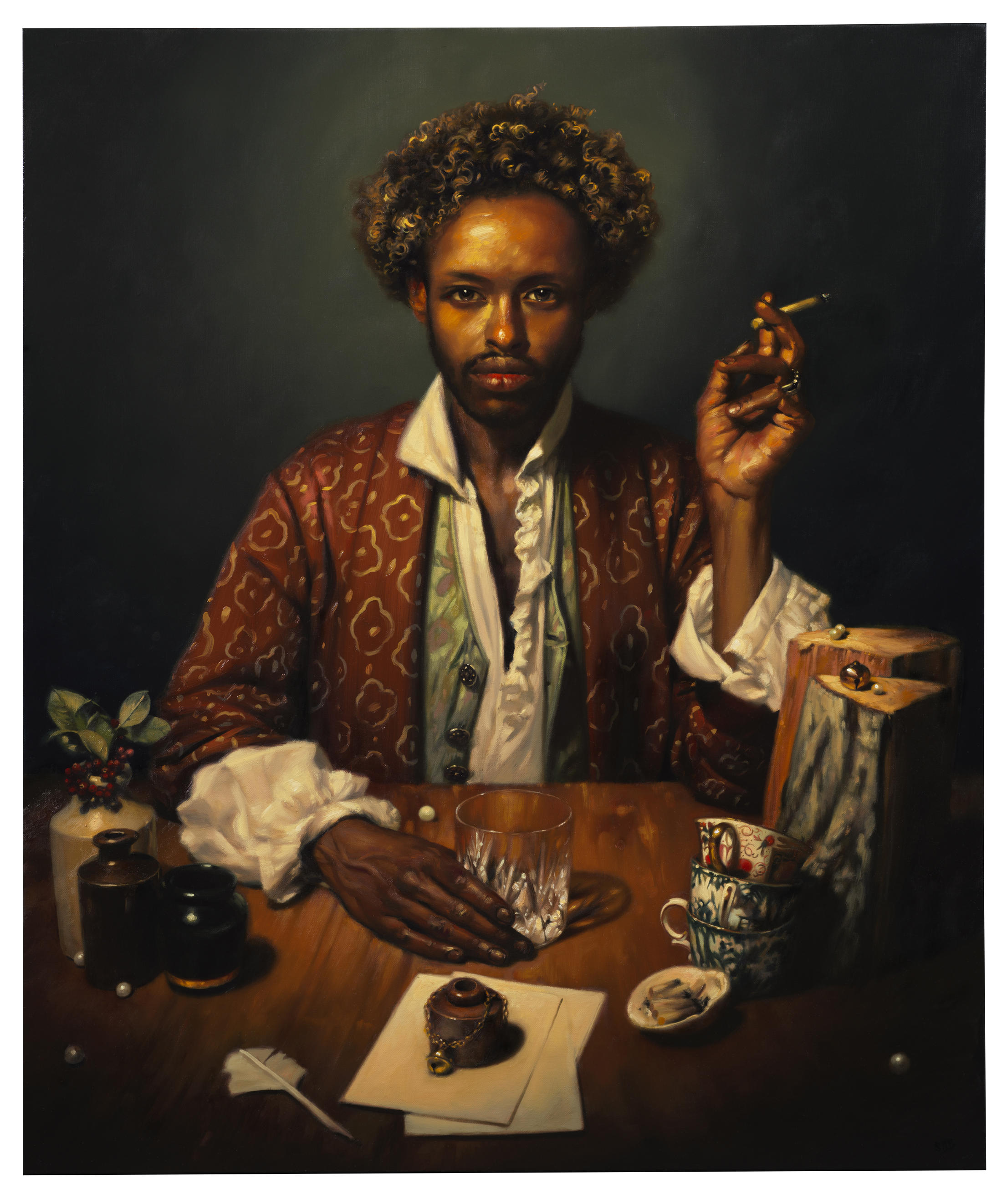 His pose, with his hand aloft and crossed fingers, coupled with the complex cut glass on the table, recalls Leonardo da Vinci’s Salvator Mundi. It is a rather irreverent reference, with Christ’s gesture of benediction and the orb signifying the Earth replaced with a cigarette and a glass of whisky. This playful allusion is characteristic of Appleby-Barr’s engagement with the old masters. The dark setting, illuminated with a strong and warm light, adds to the sitter’s saintly air, the light behind him even forming a sort of halo. His posture, to the modern eye, also has an affinity with camp culture, a recurring element in Appleby-Barr’s work.