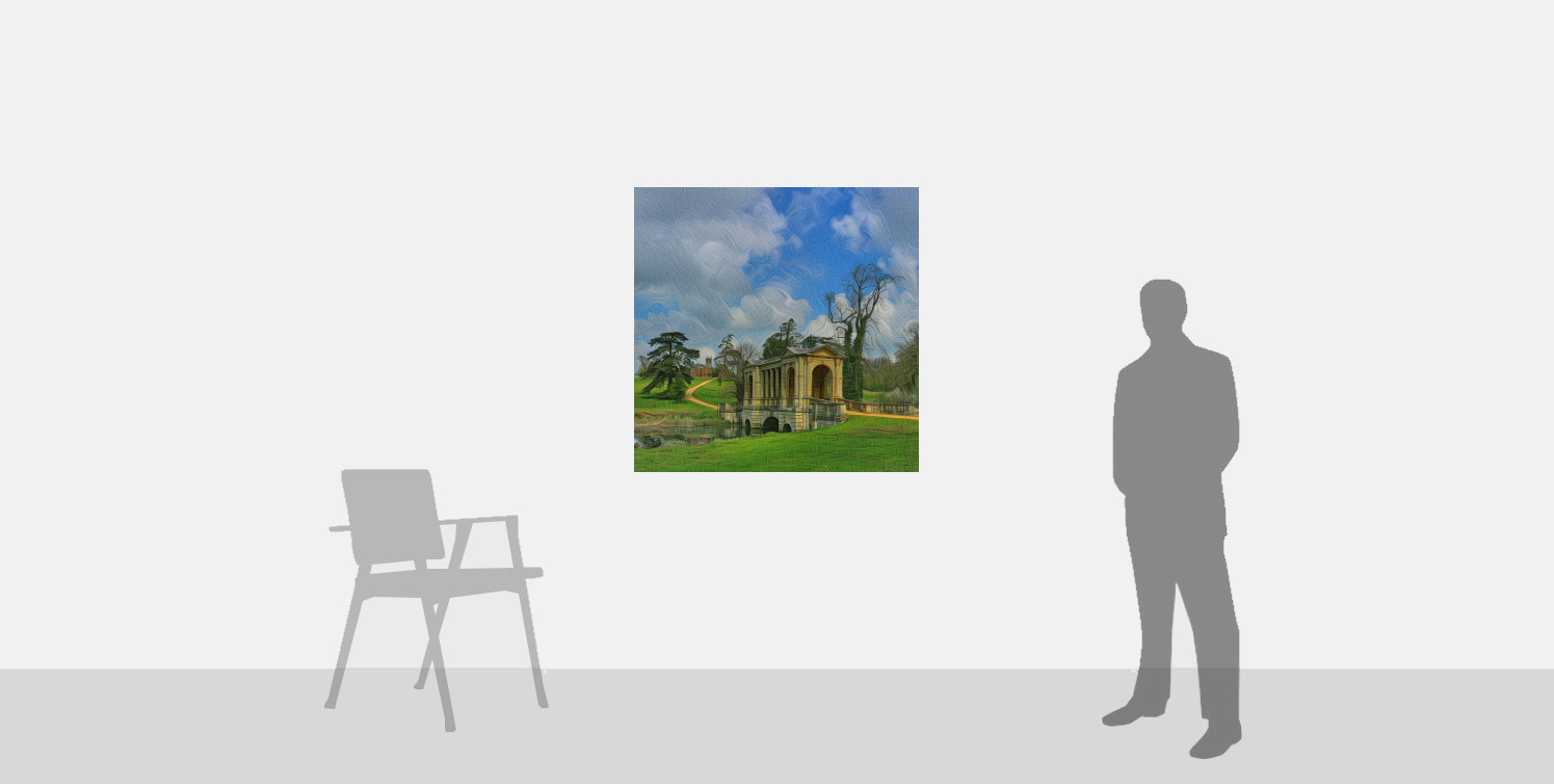 Stowe is part of Ambrosi’s innovative Dreamscape series, combining original photography, computer graphics and artificial intelligence. The landscape depicted is the English country estate of Stowe, with the famous Palladian Bridge in the foreground, and a path winding towards the Gothic Temple in the distance. This artwork is from a body of work in which the artist investigated the landscapes of the 18th-century luminary and designer Capability Brown, who shaped the estate and gardens of Stowe almost 300 years ago.