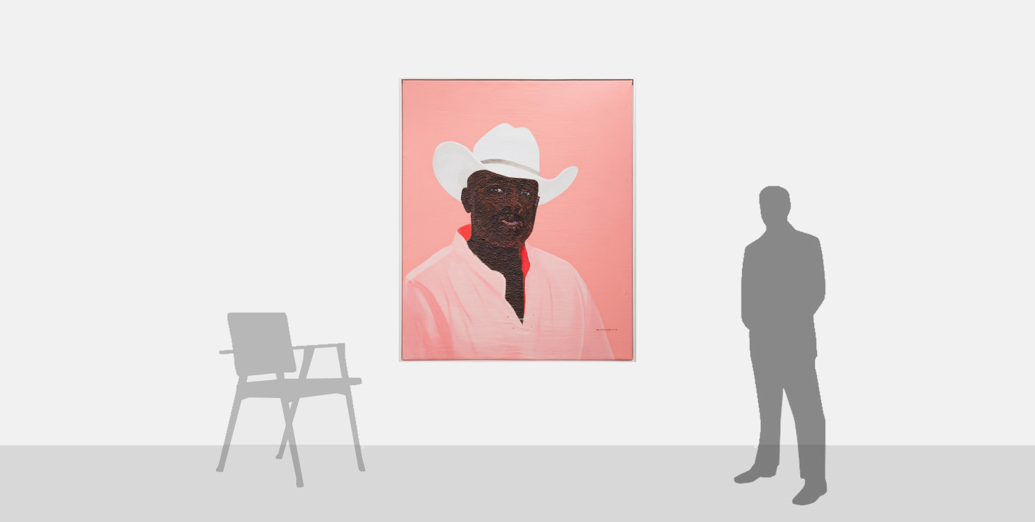 Strawberry Bob exemplifies Olayombo's practice for which he has gained widespread recognition. The work exhibits Olayombo's characteristic handling of paint, applying the medium in thick, textured impasto with a palette knife to evoke the physicality of his subject's skin. The sugary pink shirt and background question our preconceived ideas surrounding the supposed violent masculinity of the cowboy, and the figure exposes us to a hidden history, in which up to a quarter of cowboys in the American West between 1860 and 1880 were Black. Olayombo presents us with a complex, sensitive and herioc evocation of an overlooked protagonist. This painting was presented at the artist's inaugural solo exhibition, held at ADA Contemporary, Accra, in 2022.