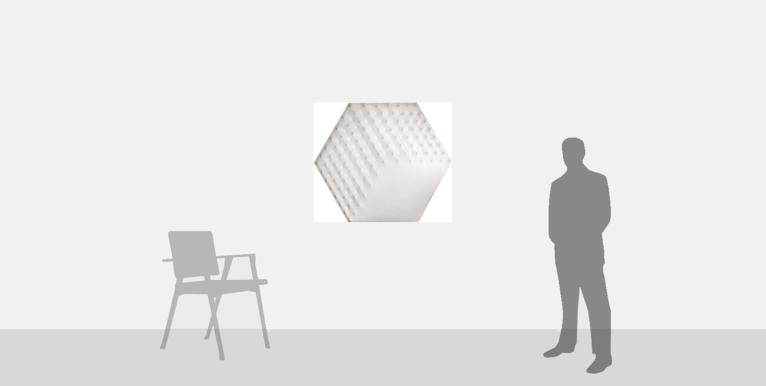 This hexagonal canvas, realised by Castellani in 1970, is a rare work (there are but two or three examples in this geometric format in existence), and moreover presents a visually compelling surface. The appearance of the work shifts and changes in an almost infinite range of possibilities depending upon the angle at which it is viewed together with the light, and what emerges is a universe in which the viewer might lose themselves, sharing in the artist's obsession with impressing rhythm upon the canvas. The lower part of the canvas, not by chance, appears free from the "dotting" that punctuates the upper surface, creating myriad further visual effects, from the acceleration of rhythms as they gravitate into the centre and out to the edges, the outer limits of the surface. A play of light and dark unfolds, finding an interval in the space devoid of nails, just as in a musical score that demands a lengthy pause. Even without direct light, Castellani's canvases reveal their universe in full, calmer, less rich in contrasts, but equally vitalised by the movement of the nails. A place in which to project one's own thoughts or, simply, to allow the viewer to remain in the uncertainty of being able to discover all the rhythmic solutions that the canvas offers.
