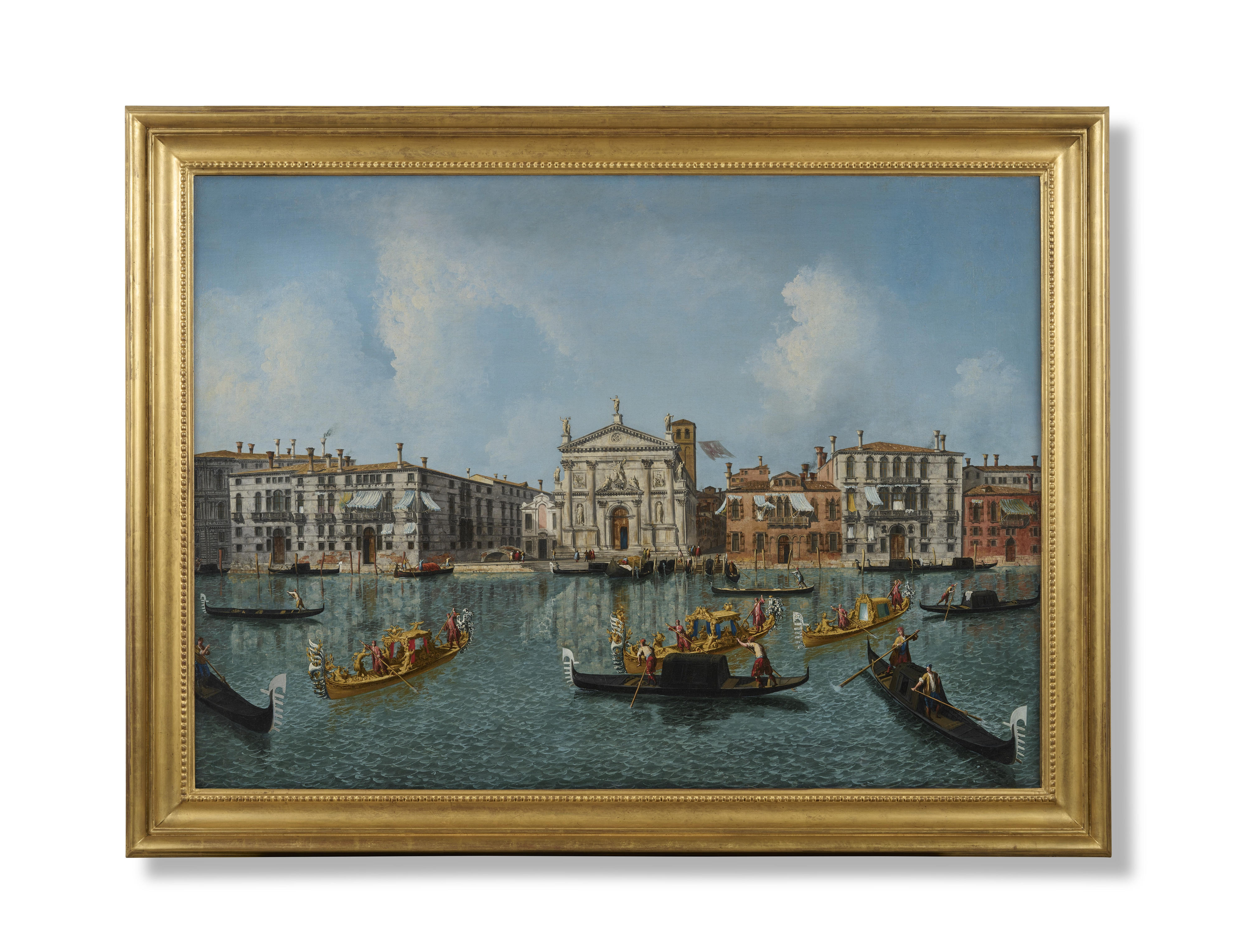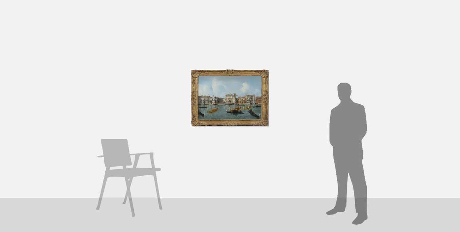 Of the three opulently embellished and gilded gondolas poised upon the shimmering water of the canal, the two leftmost were once identified as belonging to the Giustiniani, one of the oldest noble families of Venice, on account of the double-headed eagle which sits on their respective rooves; more recently, Montecuccoli and Pedrocco have suggested that these gondolas are in fact those of the imperial ambassador to Venice, and note that the very same gondolas appear in the foreground of Canaletto’s Reception of the Imperial Ambassador, Count Giuseppe di Bolagno, at the Doge’s Palace (private collection).1 According to Pompeo Molmenti, the ambassador landed at the Molo on 16 May 1729 for his first audience at the palace, though it is not known how long he stayed.2 These three gondolas appear again in Marieschi’s smaller canvas of the same view of San Stae, in a Parisian private collection, as well as in his view of the Bacino di San Marco, also in a private collection.3 Toledano considers all these three paintings to be mature works, datable to the end of Marieschi’s life, on account of the vibrant impasto of the facades and the sensitive rendering of the shimmering water, while Pedrocco and Montecuccoli date all three works more specifically to 1735 on the basis that the gondolas are also seen in Marieschi’s painting in Claydon House, Buckinghamshire, the Rialto Bridge with the arrival of Archbishop Francesco Antonio Correr (1676–1741), an event that took place on 7 February of that year.4 Given their appearance at both this and the 1729 state event, and given that the Imperial ambassador was almost certainly not still in Venice in 1735, it seems most plausible that by this time the gondolas were simply used by the state for particular official occasions. Whatever the precise date, this beautiful view is clearly a mature expression of Marieschi’s style, characterised by flickering brushwork, strong shadows and deep, dynamic space which gives his work a highly personal, almost romantic quality.