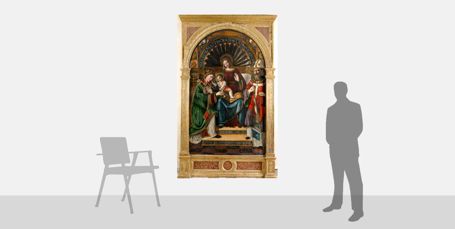 There are obvious similarities with the Master of the Pala Sforzesca: the sumptuous garments of Saint Nicholas, Saint Stephen and the Virgin echo the obsession with brocades, pearls and golds that characterize the works of that master. At the same time, the physiognomy of the Virgin descends from the celebrated and much-copied Leonardesque model of the Virgin of the Rocks: analogous replicas are found both in the corpus of the Master of the Pala Sforzesca (for example the Madonnas of Baltimore and Berlin) and in other artists active in those years, from Marco d'Oggiono (the Crespi polyptych preserved in the museum in Blois Museum) to the various Madonnas with Child of the Pseudo-Francesco Napoletano to those of Bernardino de' Conti. Meanwhile, the imposing architecture that encloses the sacred scene in the present work, namely the shell-shaped apse, is a motif that can be found in the works of the Master of the Pala Sforzesca (for example in the Sant'Ambrogio in the Accademia Carrara in Bergamo). Yet, the greater monumentality and the presence of the graduated clypeus seems to indicate knowledge of models such as the polyptych of Treviglio by Butinone and Zenale, and perhaps even of the Milanese works of Bramante. We are therefore faced with an artist who in the last decade of the fifteenth century, to which date the present work should be assigned, was receptive to all of the innovations that were taking place in the Milanese scene, with very strong similarities to the Master of the Pala Sforzesca but also to other artists such as Bernardino de'Conti or Bernardo Zenale. Given our currently imperfect understanding of the career of De Predis, above and beyond his role as a transmitter of Leonardesque models, and exponent of court portraiture, it is not impossible to discount the possibility that the present work might be assigned to his hand.
