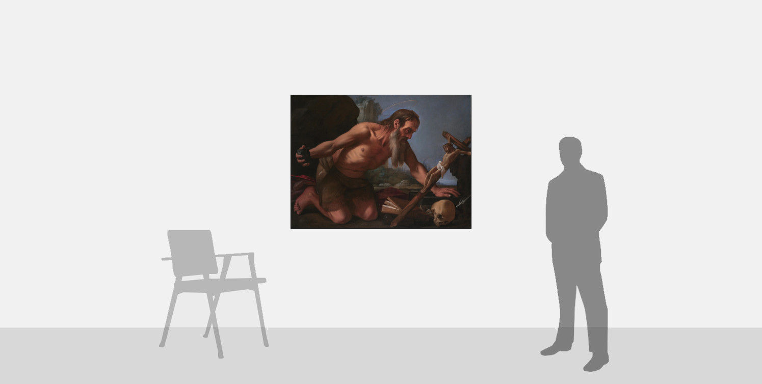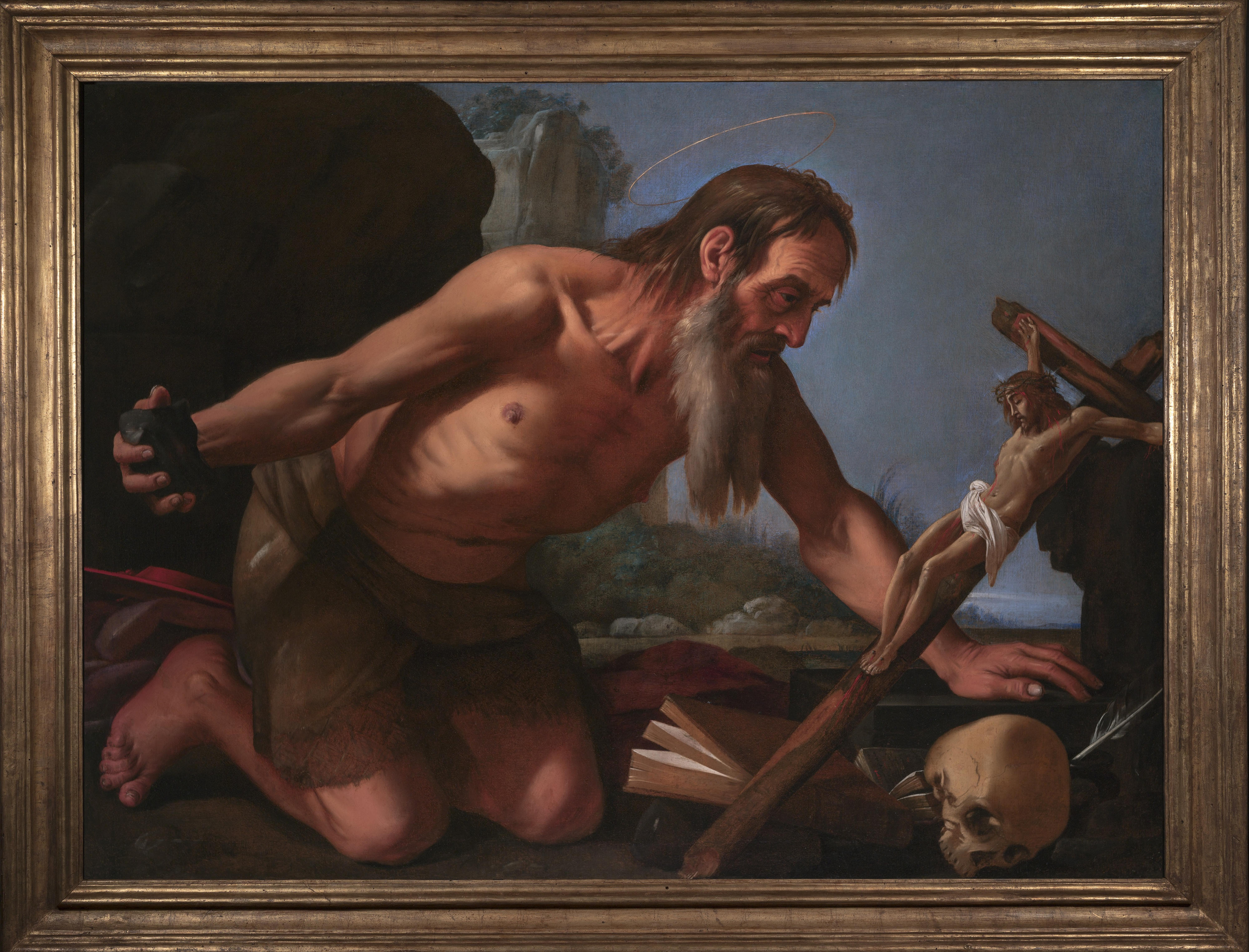 The hermit saint clutches a stone in one hand and, extending his arm in preparation to strike his chest; with this gesture, his body fills the space of the composition, involving the viewer in the drama of the representation. His other hand rests on a ledge, providing support and helping to balance the weight of his vigorous, muscular body. Jerome is covered only by a brown loincloth tied at the waist, having already laid his red cloak and cardinal's hat on the ground, attributes that allude to his ecclesiastical dignity.