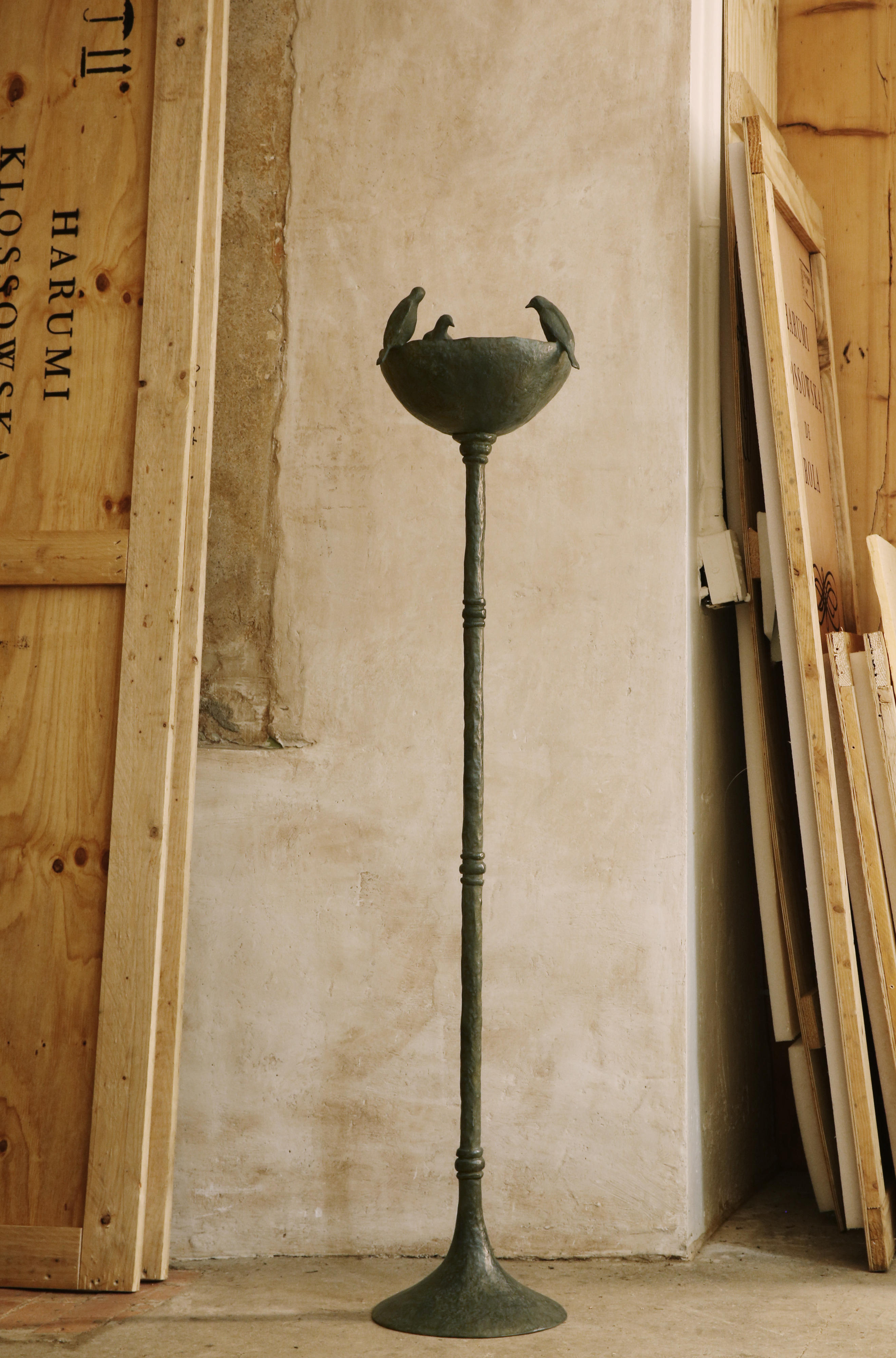 Three birds perched atop a bowl, pausing for rest during their flight, quenching their thirst, and chirping with joy at the dawn of a new day. This serene work was inspired by the birds that flourish in the gardens and woodland surrounding the artist's home in Switzerland. Harumi seeks to evoke the wonder and delight that emanates from these small creatures as they welcome the morning and fill the air with song.