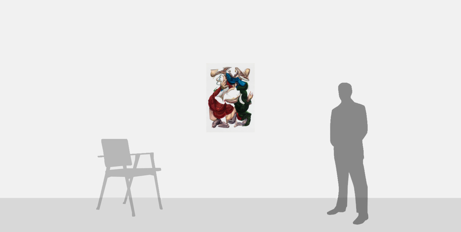 Santos’ inspirations are drawn from the more awkward or subversive corners of art history, such as Old Masters who were the eccentrics of their era, such as Giuseppe Arcimboldo, or those whose style was at odds with conventional beauty, such as El Greco or Francisco Goya. Further, his paintings take influence from the fleshy forms of Peter Paul Rubens and the expressive grandeur of Michelangelo and Raphael.