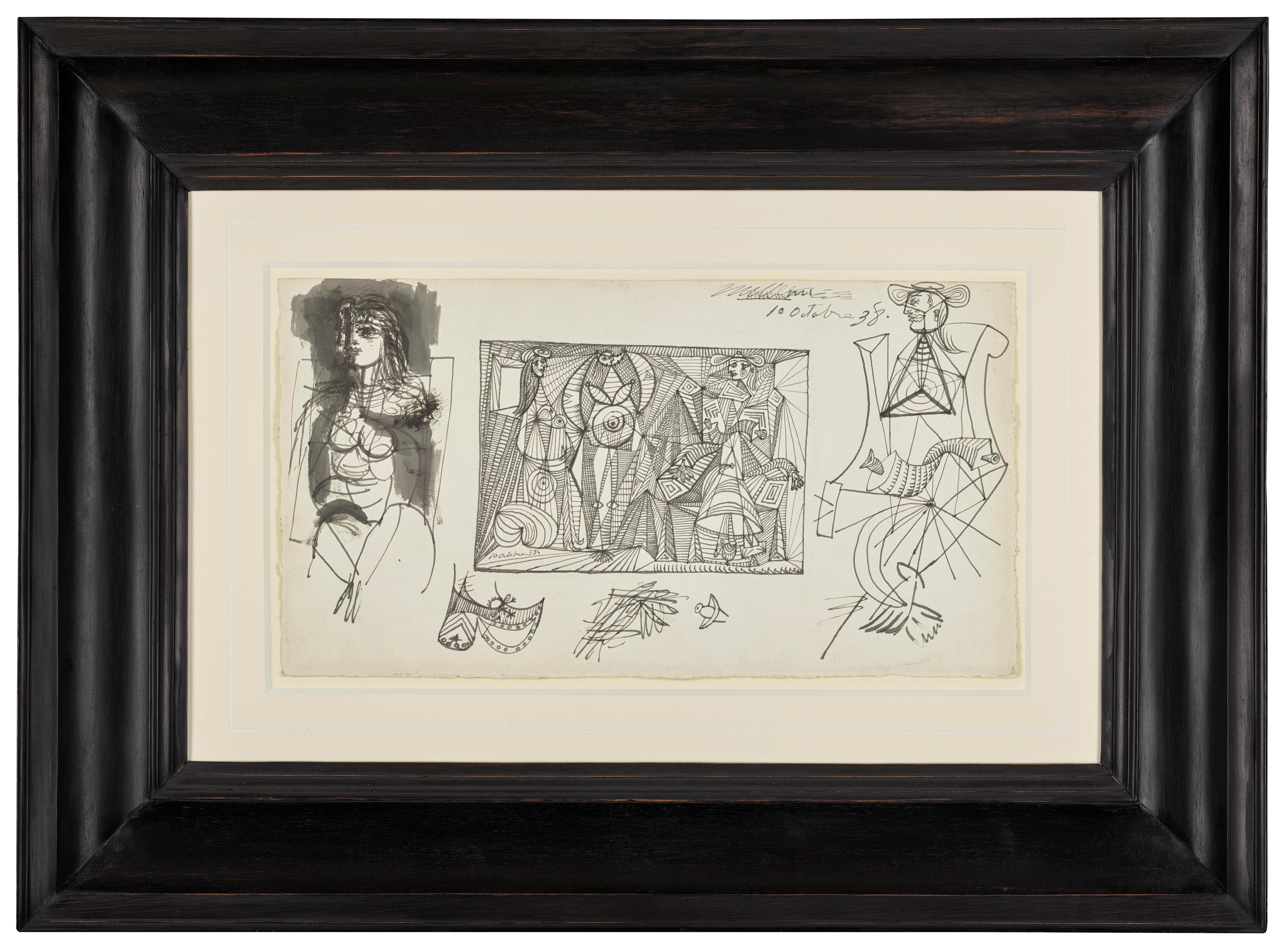 This sheet of drawings by Pablo Picasso comes from a period of intense creative energy for the artist, during the late 1930s. The pen, brush and ink studies reveal the artist’s meticulous approach, even in preparatory works, and allow us to consider the transformation of the human figure into his instantly recognisable geometric style, formed of distinct shapes, patterns and volumetric forms. The sheet contains a highly finished central study for a composition, flanked on either side by a seated female figure, at contrasting states of abstraction. Other sketches for parts of the composition (including a shoe and a hand) are situated below the central design.