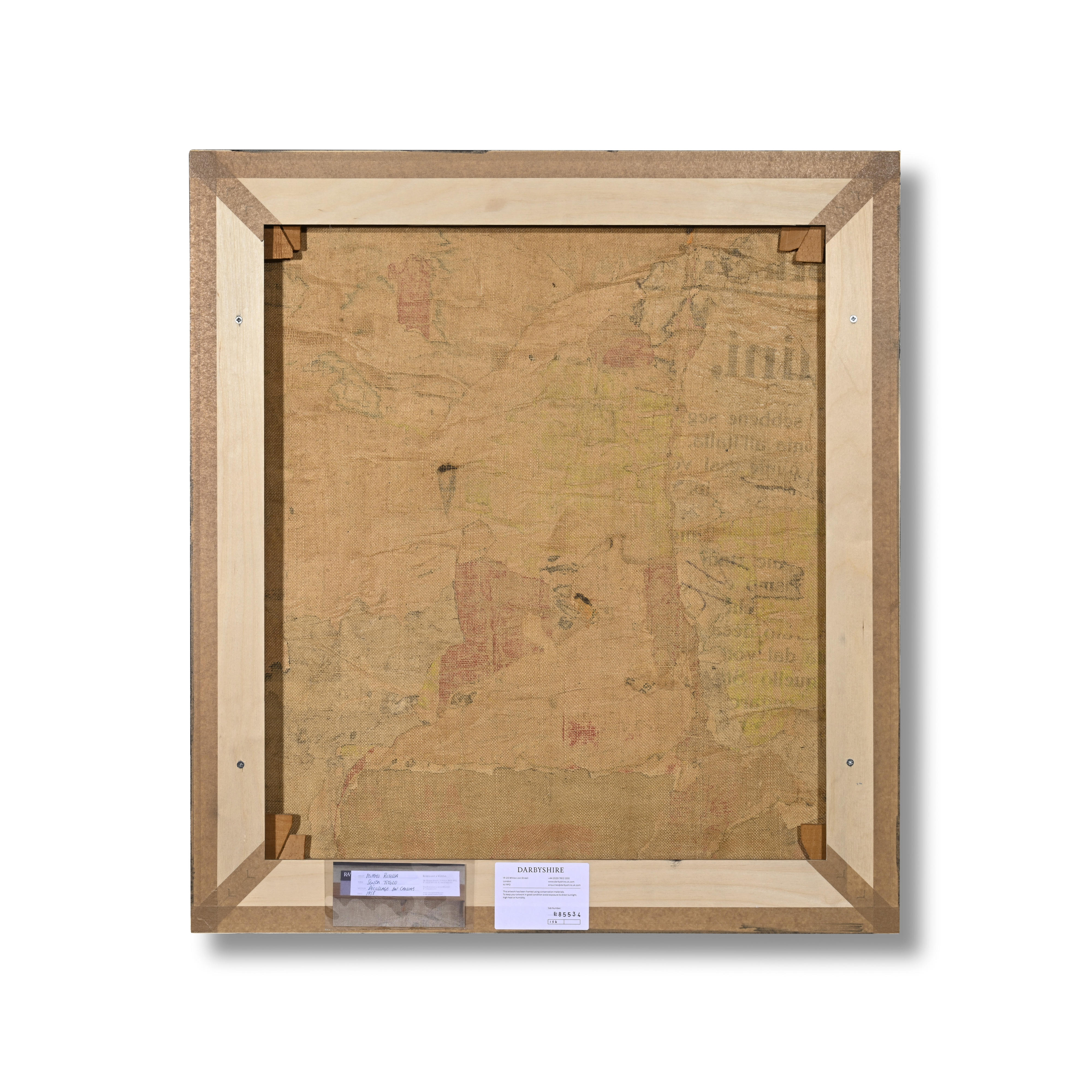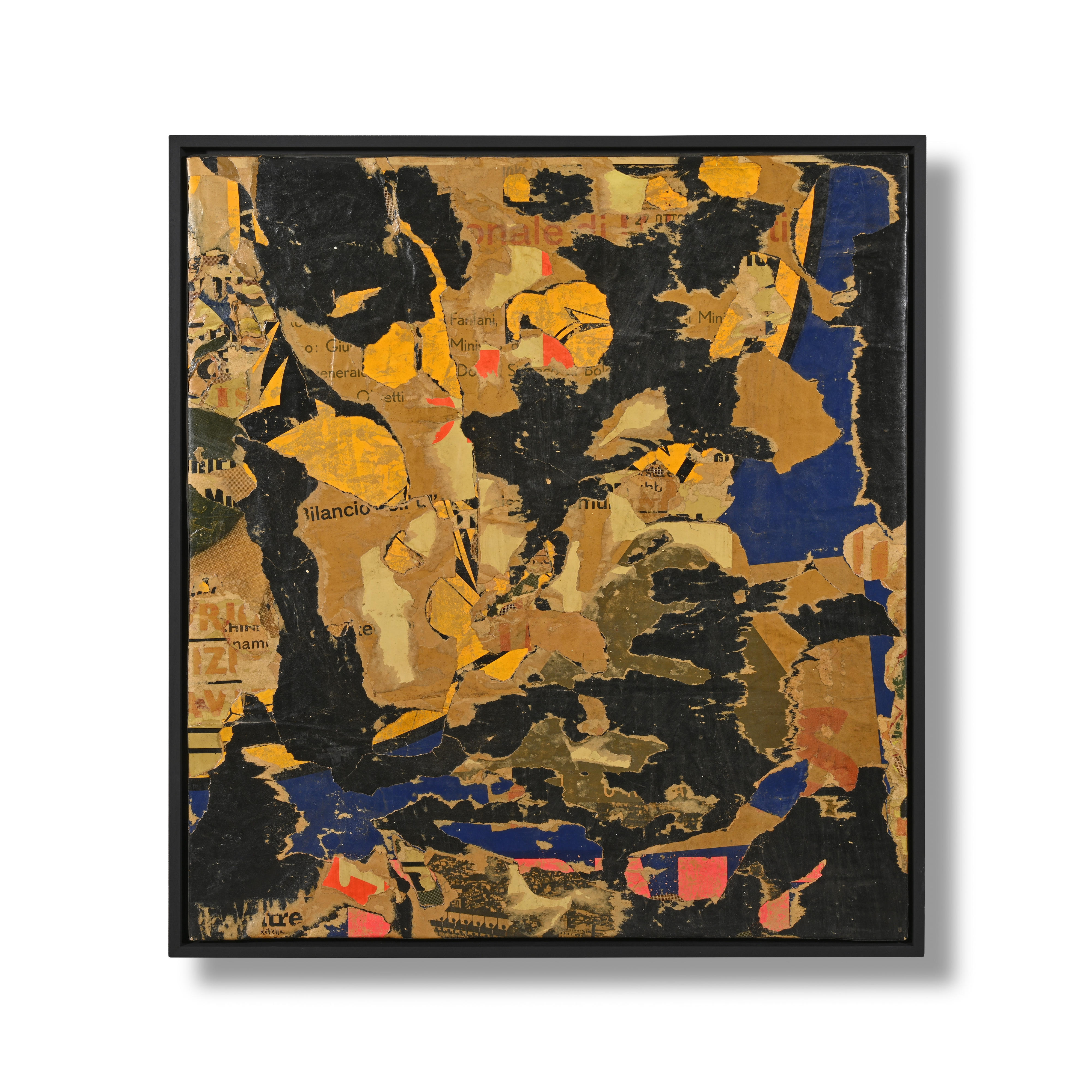 Untitled, 1960 is an early example of Rotella’s décollages, an artistic practice that involved the removal or tearing of pieces of worn-out commercial posters from the streets of Rome, which he would later reassemble by applying Vinavil (a PVA-based adhesive) diluted with water on prepared canvas. Pursuing his investigation into abstract art, by re-appropriating the designated intellectual frameworks of the posters’ content, his abstract compositions introduced new visual dialogues that aimed to highlight aesthetic values such as the vitality of colours, materiality and compositional conception. More specifically, the present work reflects the delicacy of Rotella’s craftsmanship by showcasing the formation of a carefully abstract compositional construction which involves the relationship of colours and the juxtaposition of the roughly shaped strips of paper.
