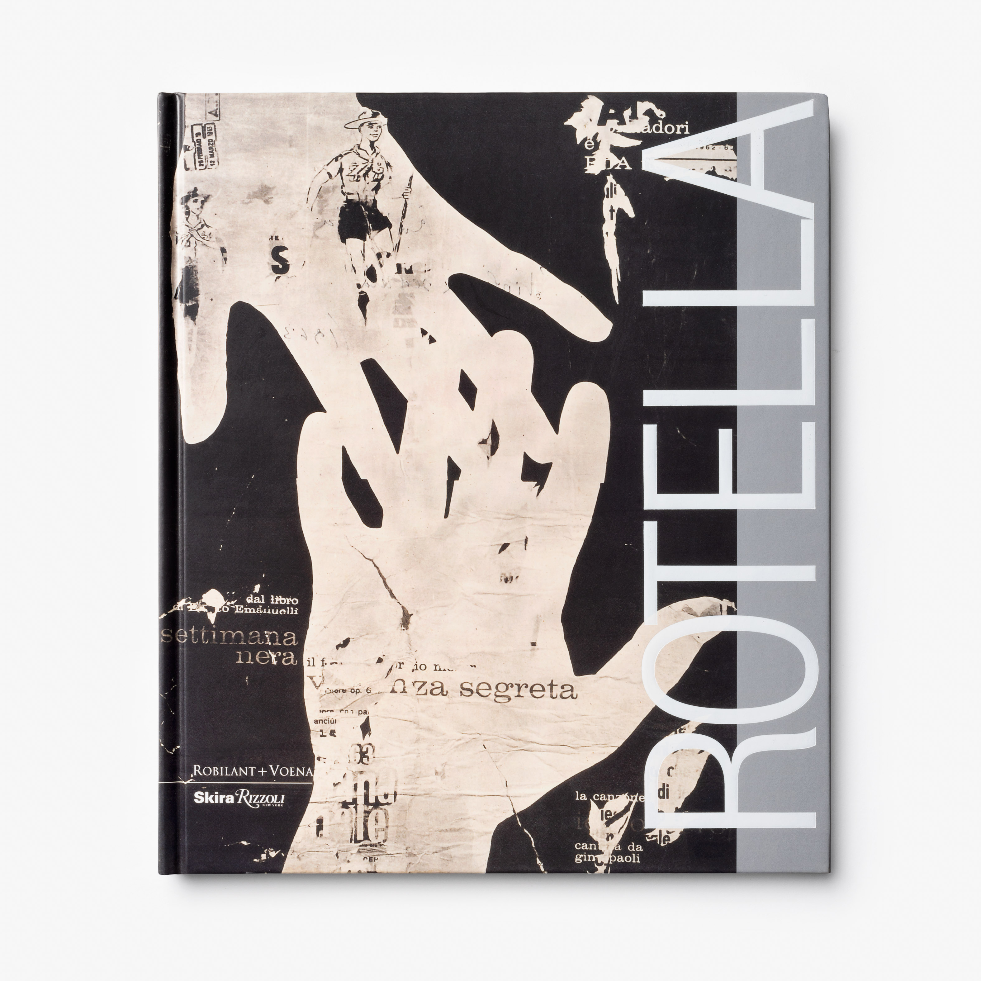 By 1961, when he was already attracting the attention of art critics and important collectors, he accepted Pierre Restany’s invitation to become part of the Nouveau Réalisme movement. Three years later he moved to Paris where he developed his Photographic Reproductions, projecting negative images on emulsion covered canvases. He then made the artypo series, created by randomly gluing typographic proofs onto canvas, and in 1975 his first plastiforme, where ripped posters were placed on a polyurethane support. Lastly in 1980, Rotella moved to Milan and created his blanks, covering ripped posters with monochrome sheets of paper, creating blank areas in the original image according to different aesthetic and compositional criteria. In 1984 he revisited the most defining practice of his artistic oeuvre, the décollage, and produced the series Cinecittà 2, followed by the sovrapitture, the process of intervening graphically or pictorially directly on a poster that was either intact or had been torn previously, using acrylic colours.