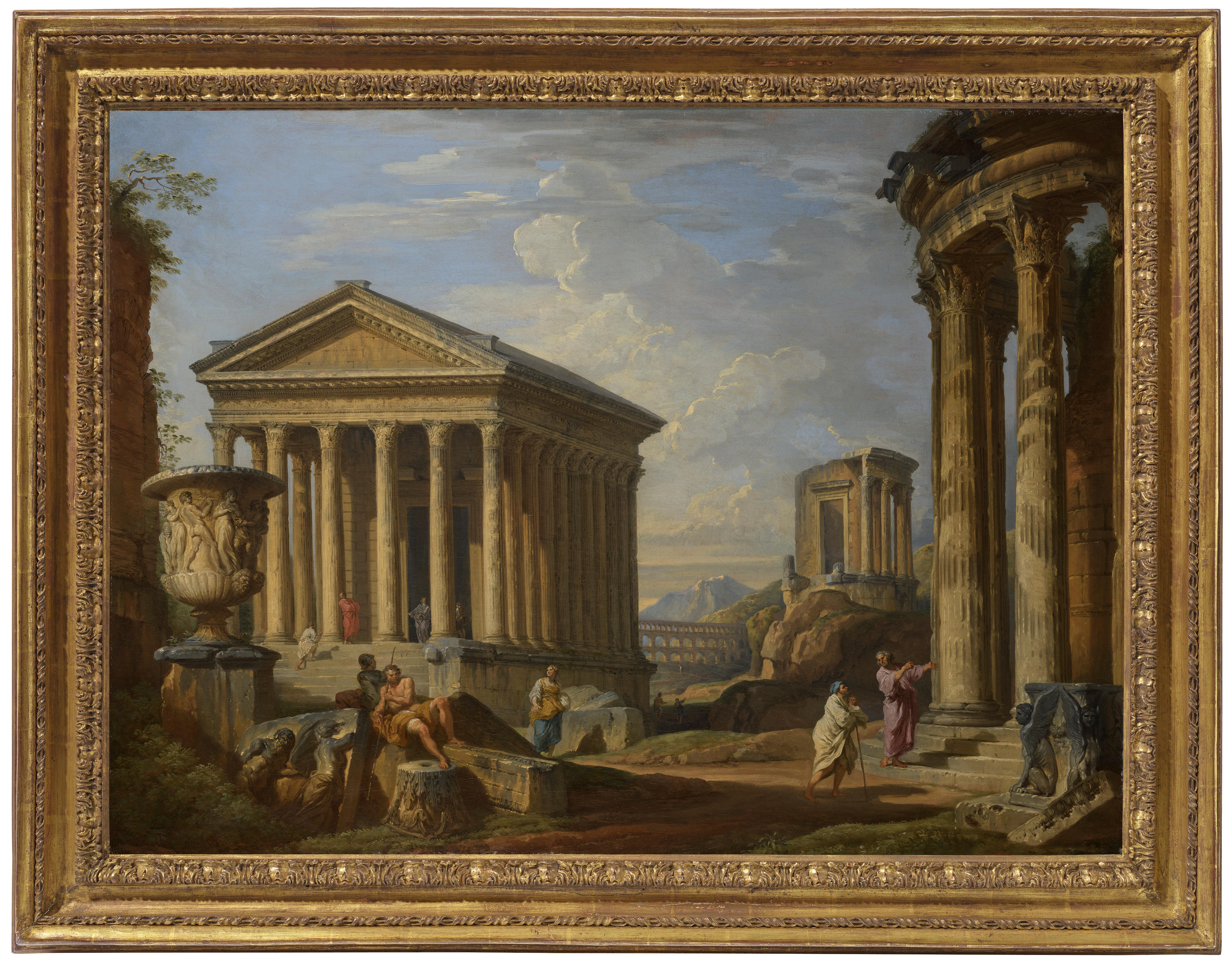 The present canvas situates several famous ancient monuments in a sophisticated capriccio. Although the artist offered accurate depictions of individual monuments, he rearranged them into a composition of his own design. At left is the remarkably well-preserved ancient Roman temple known as the Maison carrée ('square house') in Nîmes, while in the central distance appear the arches of the Pont du Gard near Nîmes. In the right background are the ruins of the Temple of the Sybil at Tivoli. The structure's elegant, circular form repeats, rotated and from a different angle, in the right foreground. Amidst antique sculptural and architectural fragments, the Borghese Vase rises in the left foreground, bearing the artist’s signature and the work’s date. As noted by Ferdinando Arisi in his monograph on the artist (op. cit.), the painting, inscribed with the date of 1739, was made during a period of particular creative fervor on the part of the artist, when he produced many of his best works.