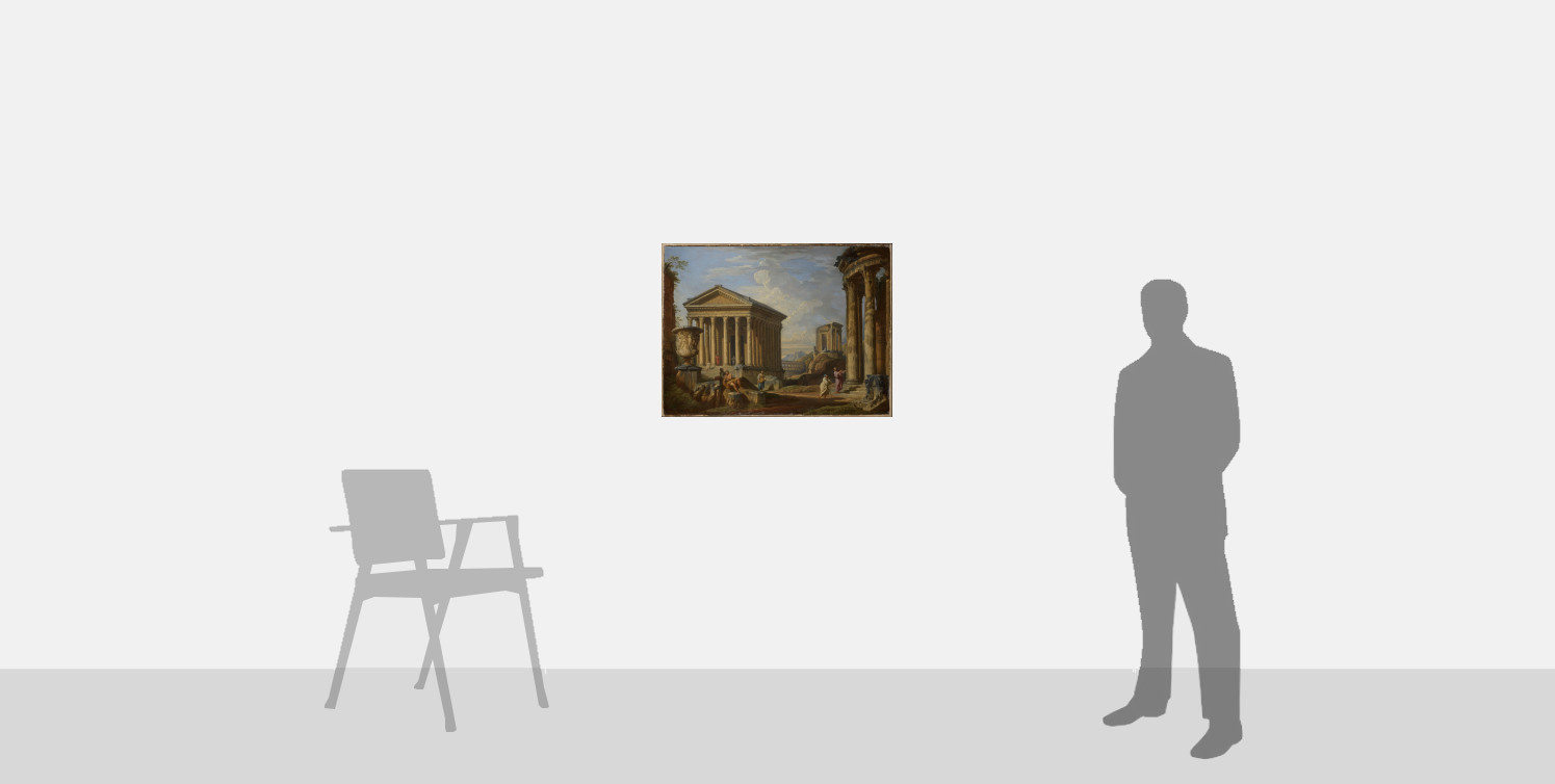 Panini initially trained in his native Piacenza, working with the quadraturisti Giuseppe Natali and Andrea Galluzzi, who specialized in the decoration of walls and ceilings with trompe l'oeil architectural schemes, as well as with the stage designer Francesco Galli Bibiena. In Rome, Panini spent the 1710s and 1720s primarily engaged in painting decorative frescoes in the illusionistic manner he had learned in Piacenza. He was enormously successful, securing the patronage of Pope Innocent XIII, for whom he decorated an apartment in the Palazzo Quirinale. A number of influences can be felt in his easel paintings of the 1730s and 40s, which marked the apex of his busy and prolific career. Panini’s adept rendering of minute detail took cues from the works of Gaspare Vanvitelli, another master of Roman vedute painting, while his inclusion of lively figures full of vitality and dynamism evidences a debt to Salvator Rosa. The capricci of Giovanni Ghisolfi, meanwhile, inspired Panini to depart from the mere depiction of real sites and scenes to the creation of fantastical new ones borne solely of his imagination.