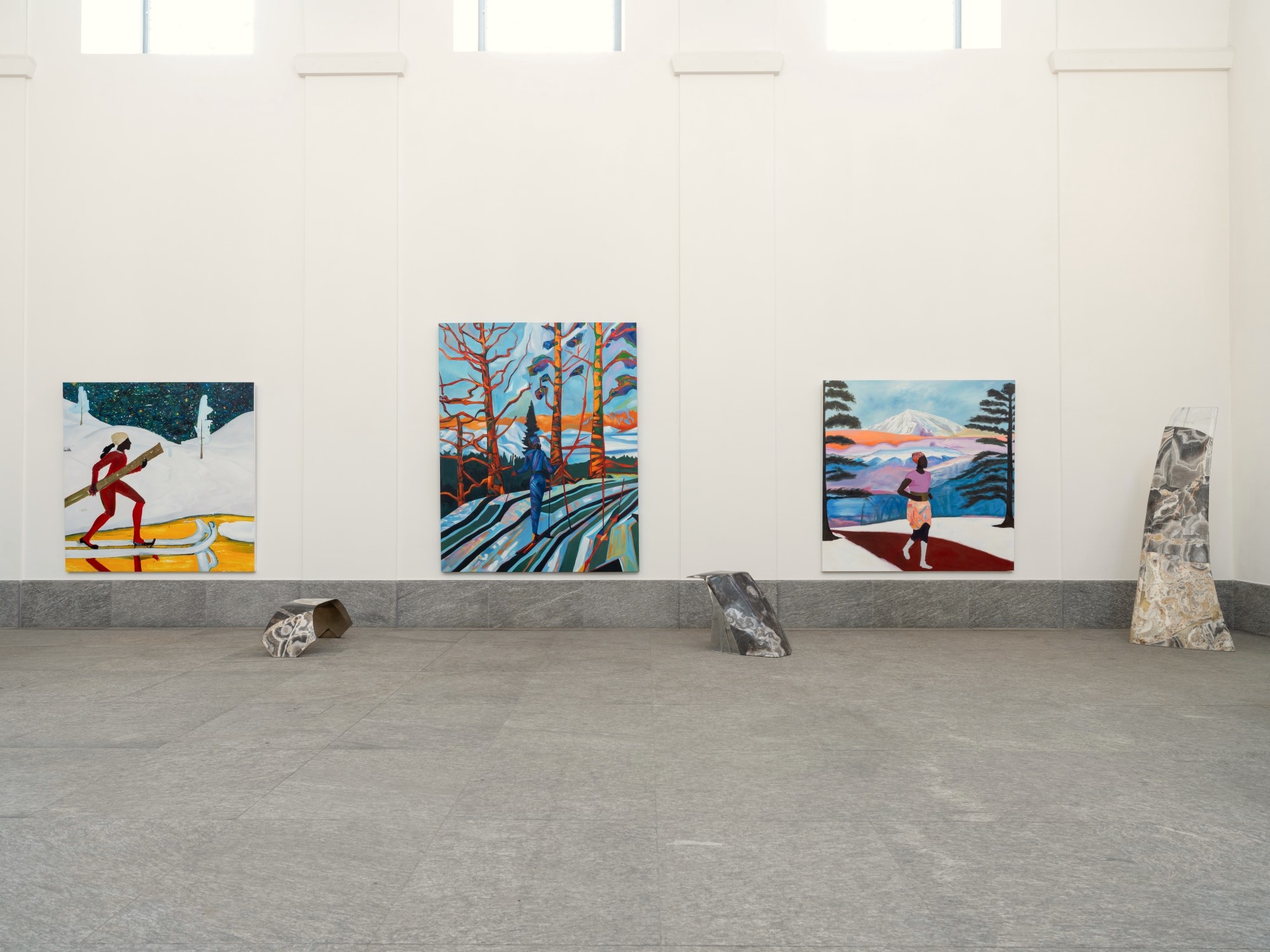 Starting from a solid colour ground, he develops the scene around his figures with painterly, foggy brushwork, playing with how perception is affected when the descriptive focus is placed not on human agents but on their surroundings. Figures materialise in recessive space, stripped of physical identifiers. Bodies are described by their painted context, highlighting Watson’s embrace of tenuous ambiguities and his close observation of the relationship between humans and their surroundings. Their quiet haziness, developed with the soft touch of Watson’s hand, probes the imprecision of memory and examines the possibility that we are all products of our environment.