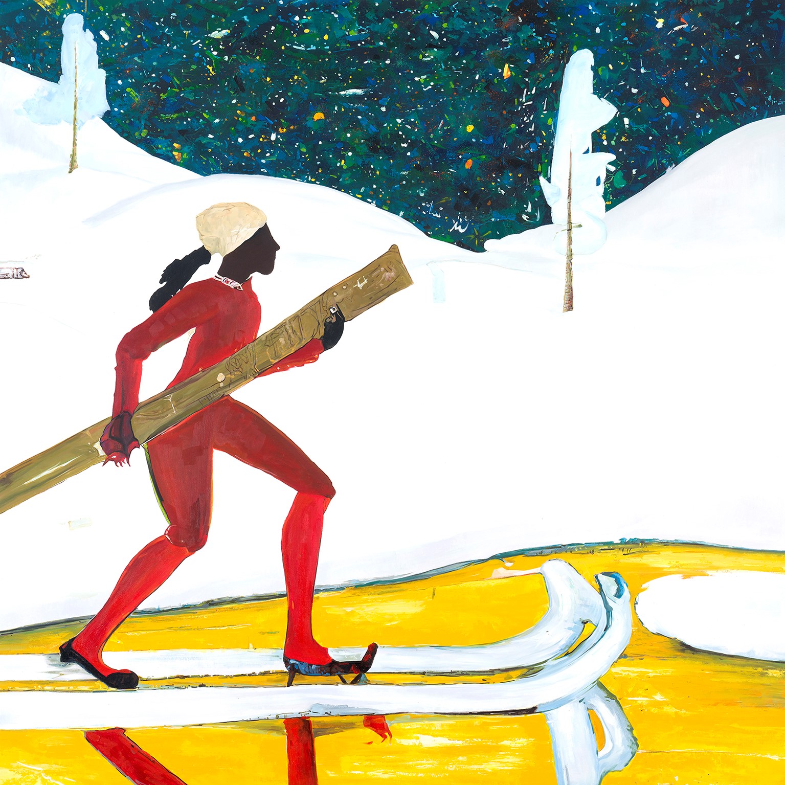 His large-scale paintings—rendered in oil paint and pastel on raw canvas—explore universal subjects such as identity, community, truth, memory, and imagination. His works are replete with art historical references to modernism, surrealism, ‘80s/’90s graffiti, Kerry James Marshall, Peter Doig, Francis Bacon and others as well as Afrofuturism incorporating science-fiction, technology, and futuristic elements into his work. His process is also very personal, drawing from his memories, experiences, traumas, and family history growing up in south side Jamaica, Queens and world travels as an adult.
