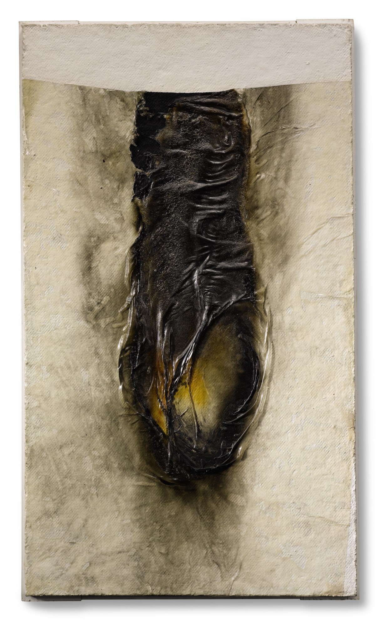 His works were resolute in their abstraction—his practice centred on experimentation with non-traditional materials including wood, tar, plastic, zinc oxide, pumice, PVC adhesives, and fabric, which he ripped, pierced, and burned to achieve dramatic aesthetic effects. Among Burri’s most famous series are his sacchi (sacks), comprising stitched and patched burlap, upon which the artist painted, and his combustioni (combustions), in which he applied fire to mass-produced plastics and rubber newly in wide circulation in the postwar period. Rejecting the traditional practice of painting on canvas, Burri’s works are often read as responses to the wartime devastation of the European continent, and acts of catharsis for the brutality of this period through decisive action.
