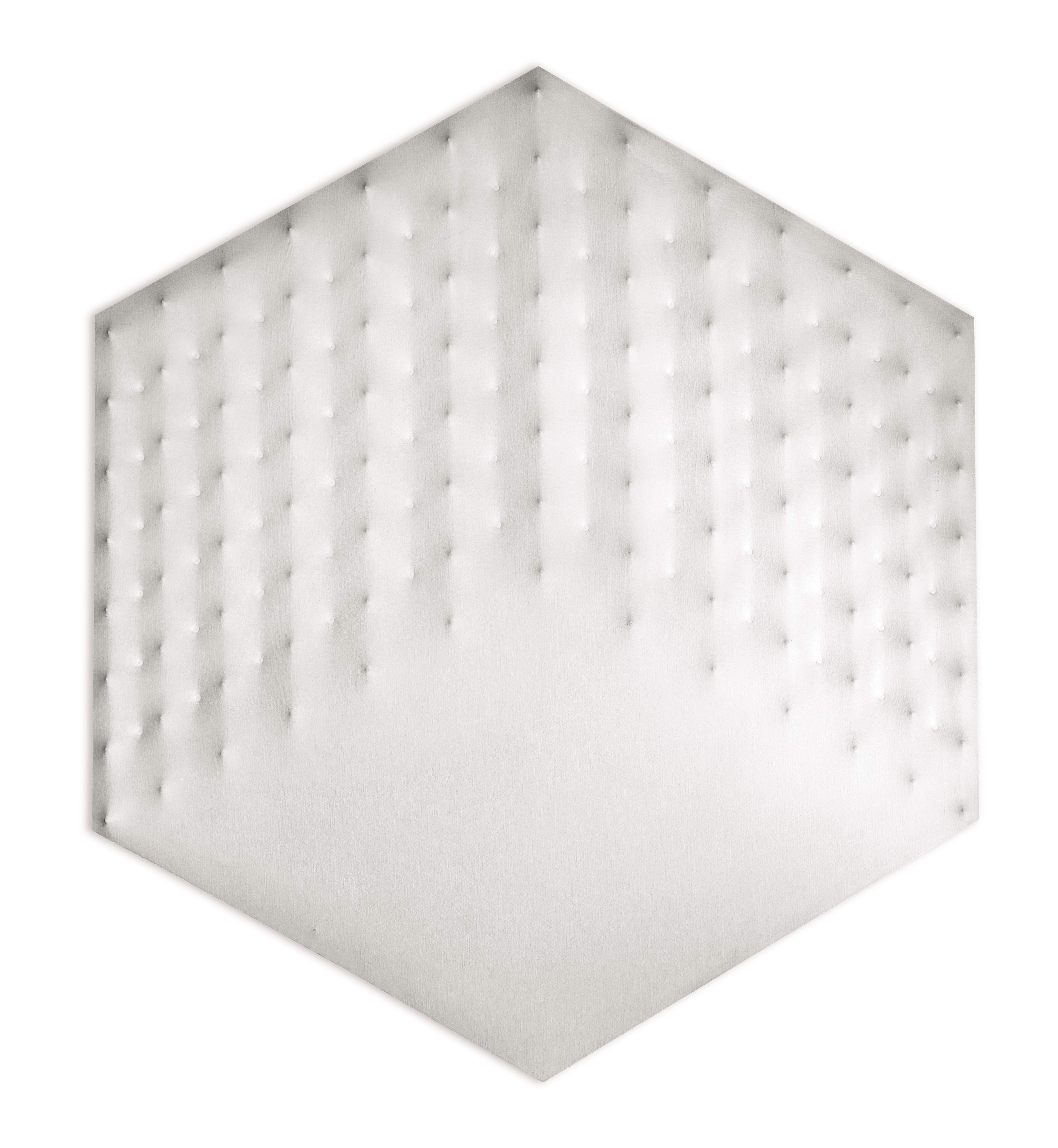 As for his work, just as Fontana broke new ground by slashing his canvases with a knife, Castellani’s weapons of choice were nails, which he drove into the frames underlying his canvases at varying depths to achieve rhythmic patterns of indentations and protrusions and then painted in a range of monochrome hues. Called Superfici (Surfaces), these became Castellani’s signature works. Hovering somewhere in between painting and sculpture in their three-dimensionality, Castellani’s Superfici have been compared to lunar landscapes, and it is perhaps no coincidence the first photos of the cratered surface of the moon were sent back to earth by Ranger 7 in July of 1964. Such contemporary references mingle with more traditional ones, as the intense contrasts of light and shadow in Castellani’s works can be associated with the painterly chiaroscuro of Italian Baroque painting.